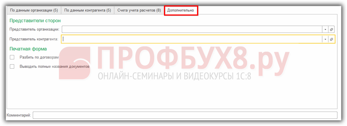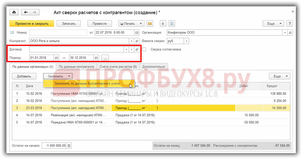 - Договор – указывается, если необходимо произвести сверку по конкретному договору. Если рассматривается сверка в общем по контрагенту, то договор указывать не нужно: