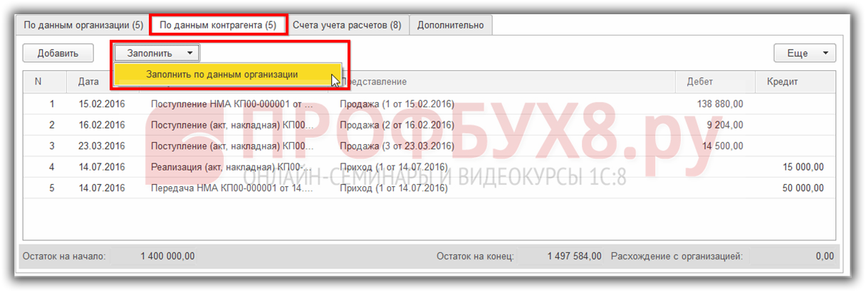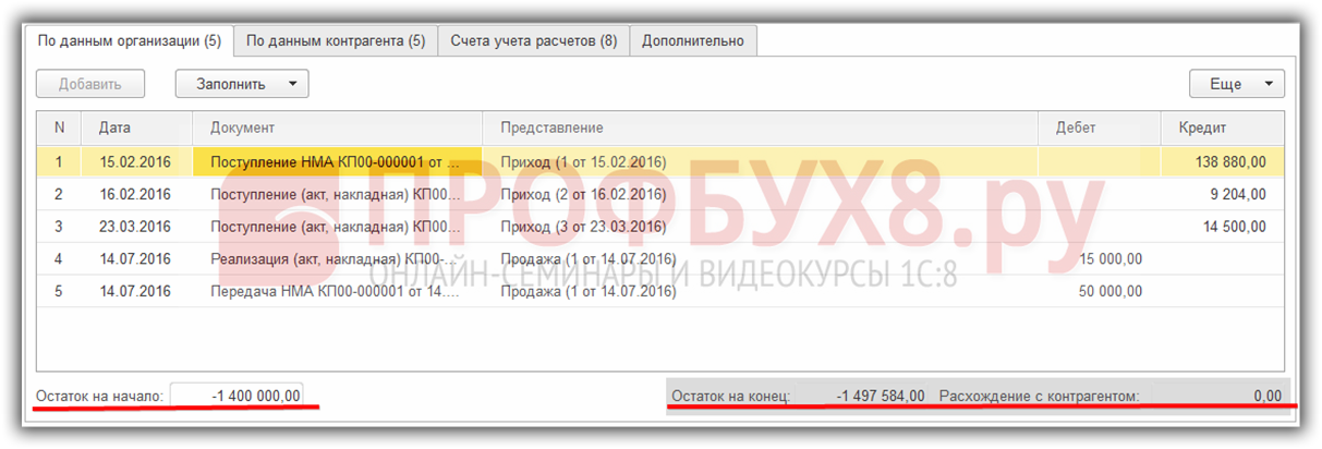 В подвале документа отражаются остатки задолженности и расхождение сумм с контрагентом: