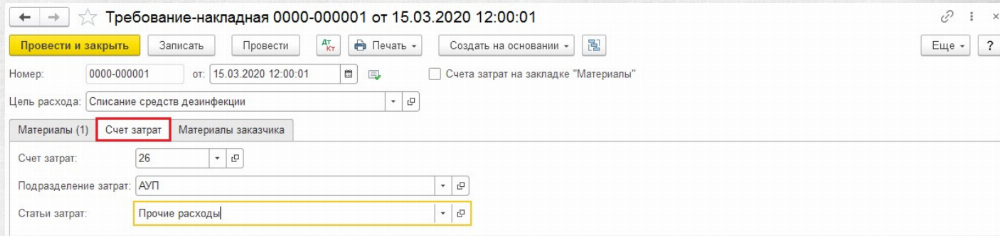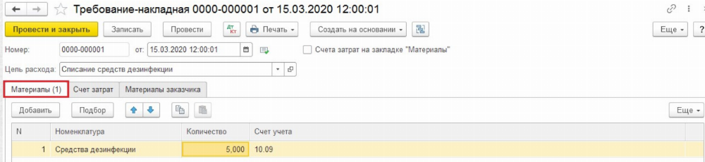 При заполнении документа на вкладке «Материалы» нужно указать списываемые средства, а на вкладке «Счёт затрат» указать куда следует отнести данный расходы.