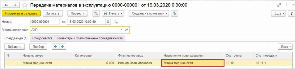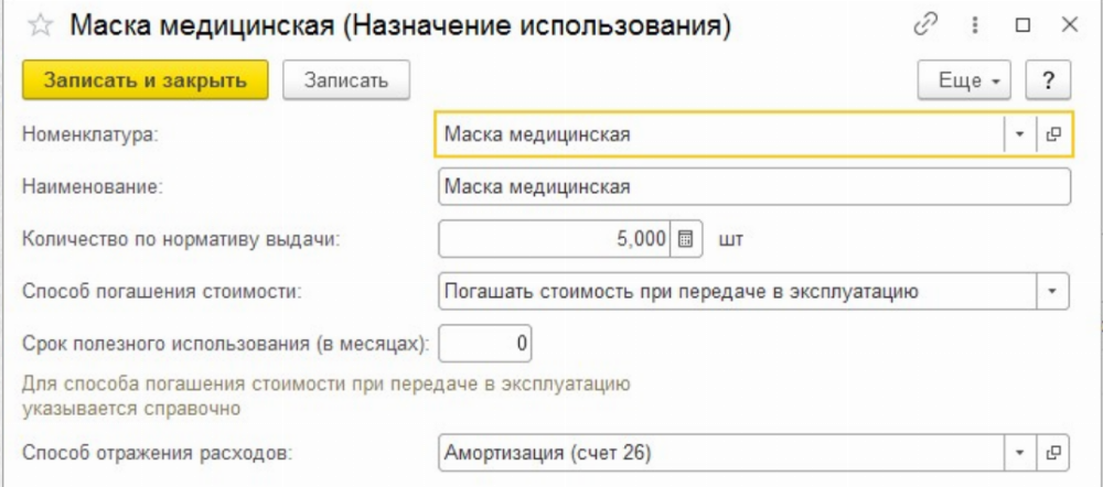 В случае приобретения обычной медицинской маски, срок использования которой должен измеряться в часах, поле «Срок полезного использования» можно заполнить нулём. Если же выдаются респираторы, имеющие более длительный срок носки, то указывается реальное время, на которое он выдаётся.