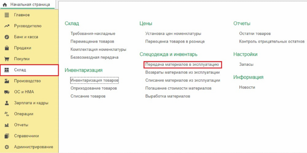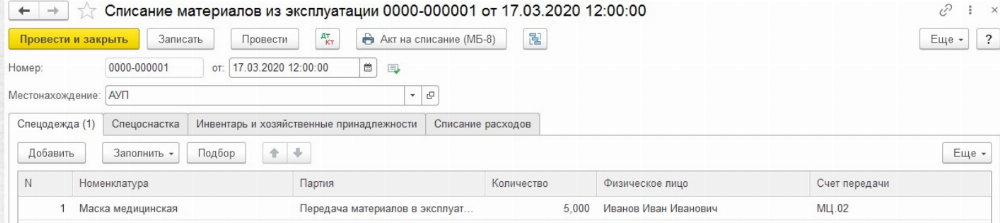 Передача спецодежды работнику предприятия осуществляется путём ввода документа «Передача материалов в эксплуатацию» в разделе «Склад».