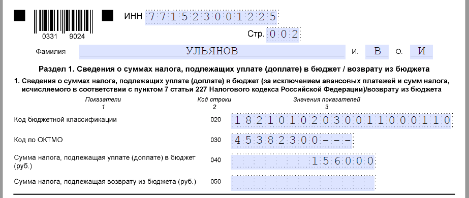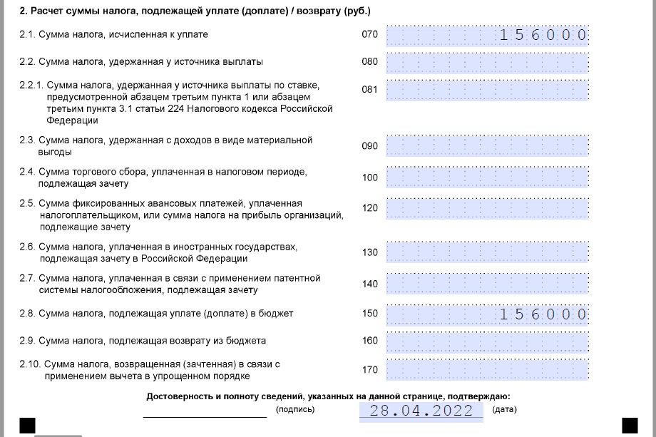 Тут сумма налога, которую надо заплатить, или ноль, если налог платить не надо. В нашем примере пишем налог в размере 156 000 руб. Здесь же указывают код КБК (код бюджетной классификации) по налогу. Для налога на доходы это 182 101 020 300 110 001 10.
