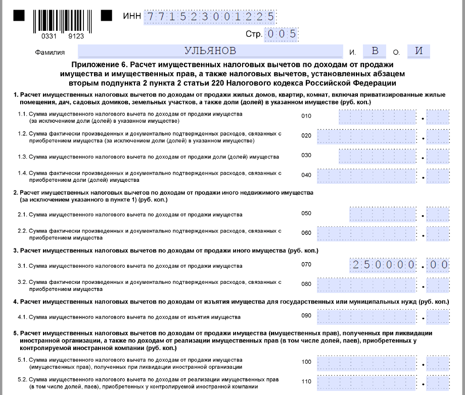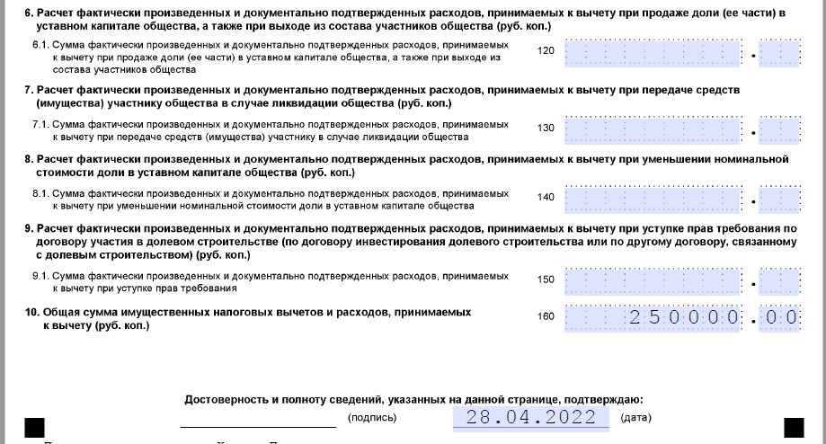 Здесь суммы, на которые вы уменьшаете доход при расчете налога (вычет или расходы). В нашем примере вы уменьшаете доход от продажи машины на вычет в размере 250 000 руб.