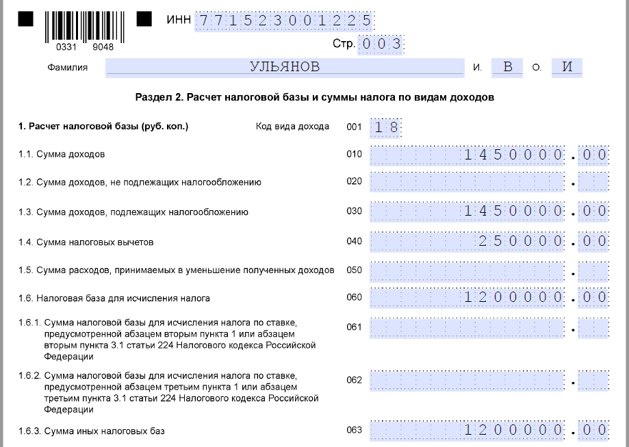 Покажем как заполнить документ на примере. Предположим, вы продаете машину, которая была в вашей собственности меньше 3 лет. Продажная цена 1 450 000 руб. Автомобиль покупает обычный гражданин. Документов, которые подтверждают расходы на покупку проданного авто, нет. Поэтому доход от продажи вы уменьшаете на вычет – 250 000 руб.