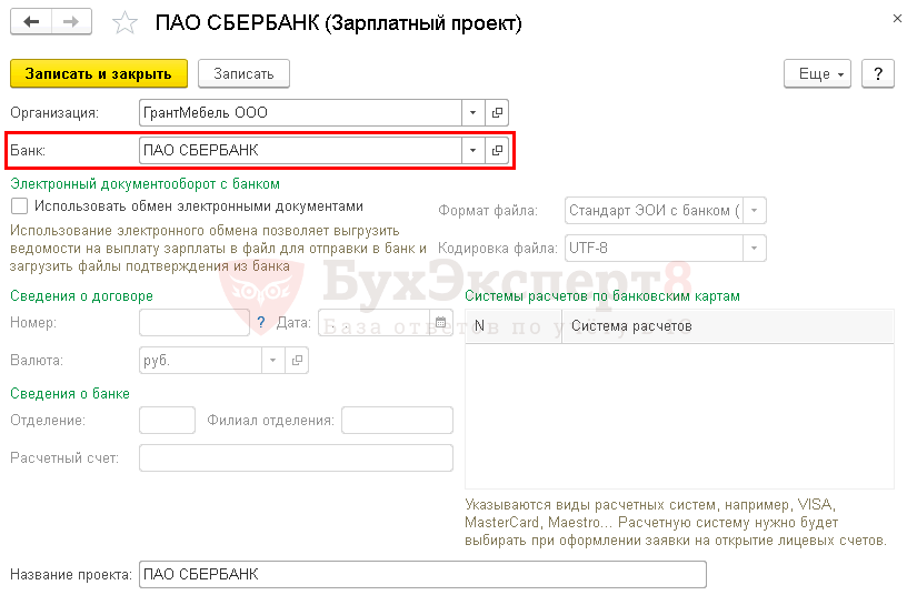 Если подключен обмен, Бухэксперт8 рекомендует для работы с зарплатным проектом 1С пользоваться специальным помощником раздел Зарплата и кадры — Зарплатные проекты — Обмен с банками (зарплата).