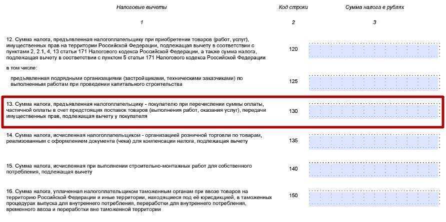 Обратите внимание, что вычет производится в сумме налога, исчисленного с отгруженных товаров (услуг или работ), в оплату которых были получены авансы. Здесь подразумевается, что если НДС с авансов начислен по ставке 20/120 %, а товар (услуга или работа) отгружен по ставке 10 %, то зачет НДС с полученных авансов осуществляется по ставке 10/110 %. В декларации по НДС полученный аванс отражается в разделе 3 по строке 070 в графе 3, а сумма налога с аванса — в графе 5