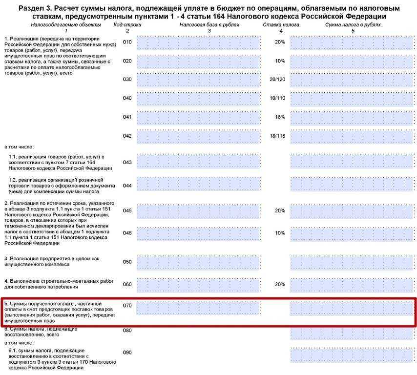В декларации по НДС полученный аванс отражается в разделе 3 по строке 070 в графе 3, а сумма налога с аванса — в графе 5.