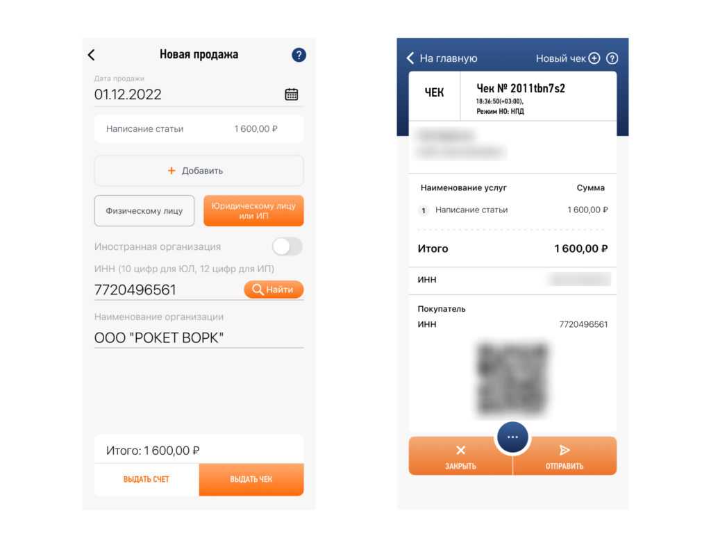 После подтверждения операции в личном кабинете приложения «Мой налог» будет сформирован чек, содержащий наименование документа, дату и время платежа, информацию о самозанятом и форме налогообложения (НПД), внесенную плательщиком налога на профессиональный доход информацию о товаре и услуге, а также QR-код, информацию о контрагенте и об операторе электронной площадки или банка.
