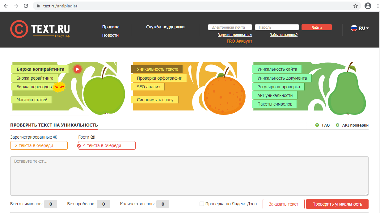 Уникальность текста проверяется с помощью специальных сервисов, например, Text.ru. Этот сервис удобен тем, что позволяет бесплатно и без регистрации проверить тексты любого объема прямо на сайте. Скачивать и устанавливать какие-либо программы не требуется. К тому же Text.ru предлагает бесплатную проверку орфографии.