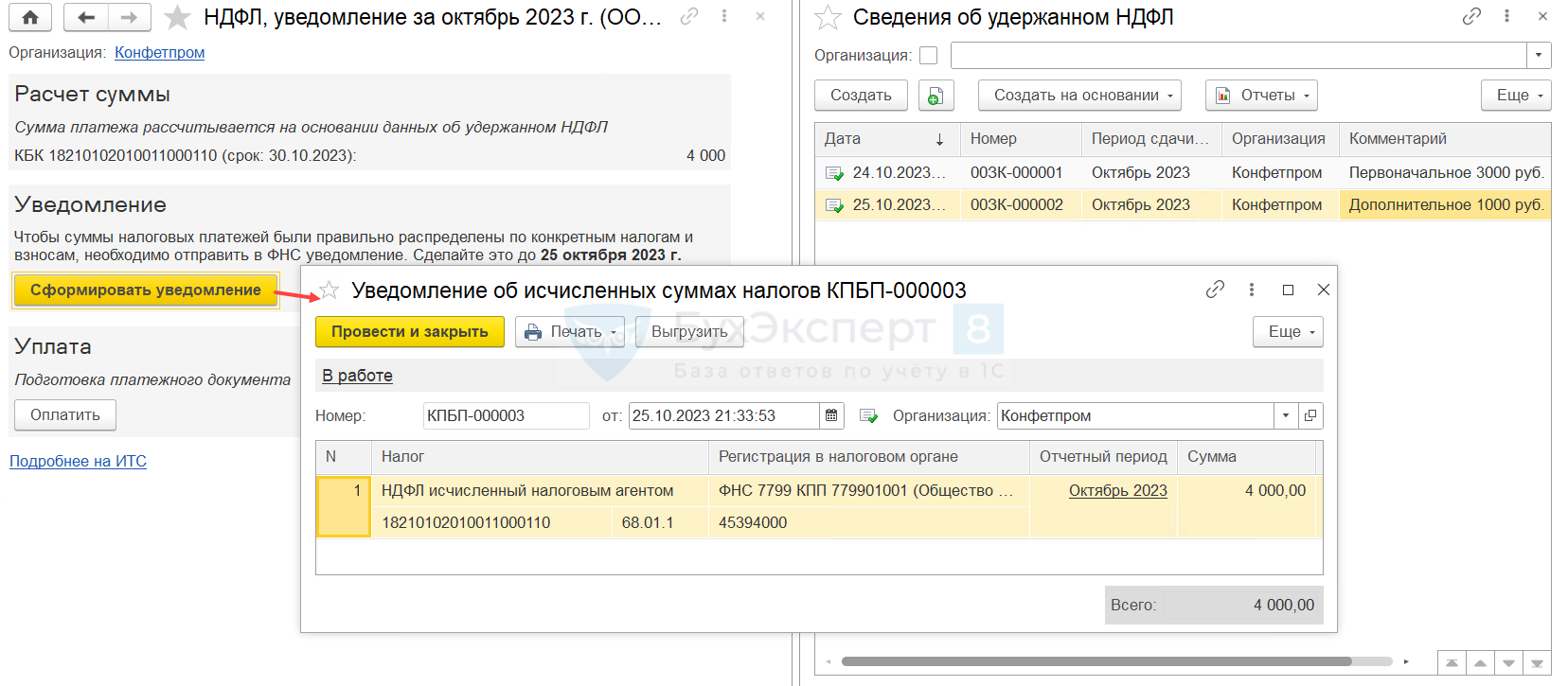 Обработка находит два проведенных документа Сведения об удержанном НДФЛ за январь. Это старый документ на 3 000 руб. и дополняющий на 1 000 руб. По кнопке Сформировать уведомление создаем Уведомление об исчисленных суммах налога на общую сумму 4 000 руб. Значение НДФЛ в нем просуммировано по двум документам Сведений.