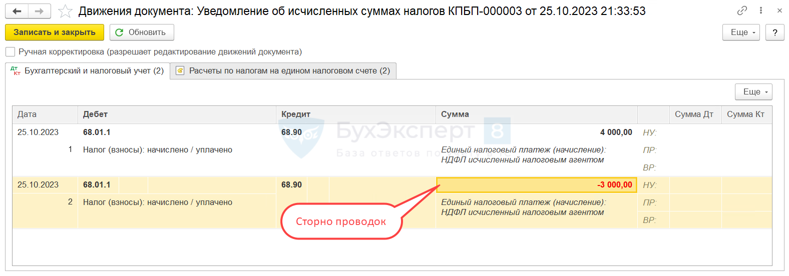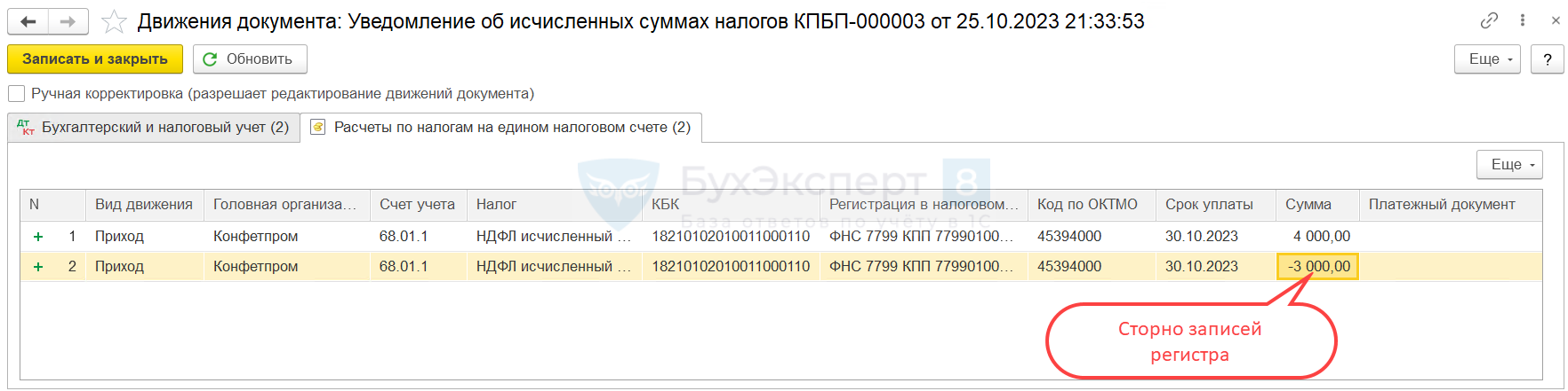 При его проведении повторного Уведомления программа отсторнирует записи по счетам и регистрам, сформированные ранее первичным Уведомлением.