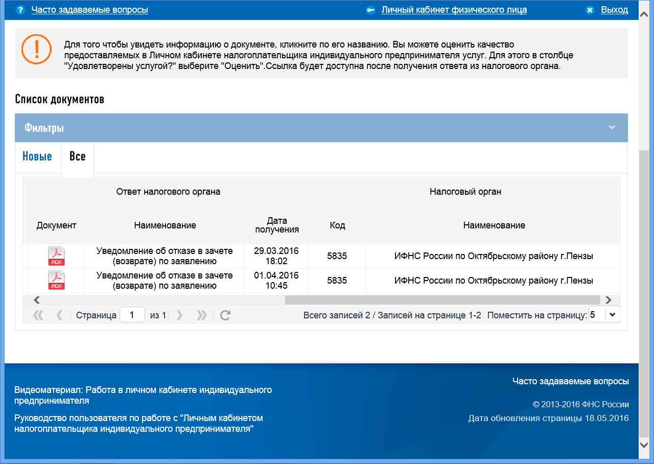 Пример процедуры подачи заявления на возврат излишне уплаченного налога в марте 2016 года через Личный кабинет индивидуального предпринимателя: