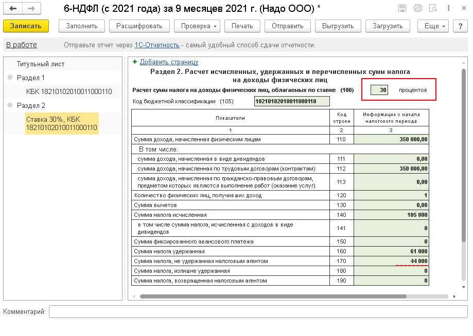 С отчетного периода, в котором произведен перерасчет налога, в Разделе 2 расчета 6-НДФЛ следует отражать итоговые показатели по ставке 30 %. В нашем Примере заполнена также строка 170 (сумма налога, не удержанная налоговым агентом), т. к. налог не был удержан весь сразу (см. рисунок). При этом уточненный расчет по форме 6-НДФЛ за предыдущие отчетные периоды представлять не требуется.