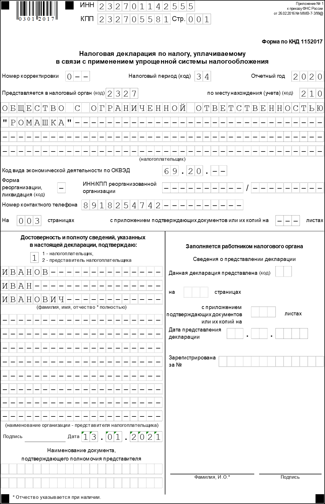 Если декларация подписана руководителем организации или индивидуальным предпринимателем лично, а доверенное лицо только ее подает, его данные на титульном листе не указываются.