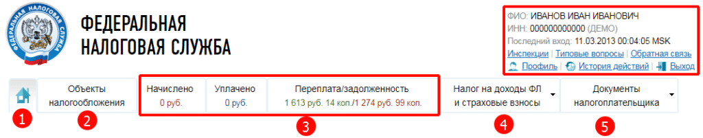 Личный кабинет налогоплательщика можно посмотреть в демо-режиме, если ввести 000000000000 (12 нулей) и любой пароль на сайте. В демонстрационной версии кабинета доступны общая информация, данные о поставленных на учёт объектах и о платежах с задолженностями и переплатами. Также там можно узнать про страховые взносы и ознакомиться с налоговыми уведомлениями.