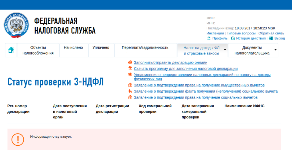 Если Вы хотите проконтролировать, что происходит с Вашей декларацией, в каком виде она дошла до ифнс, то необходимо перейти в раздел: Декларация по форме 3-НДФЛ (смотрим 8-9 шаг). Внизу Вы видите раздел мои декларации. После того, как будет статус с зеленой галкой и фразой: «получена квитанция о приеме», то можно быть уверенным, что комплект документов дошел до ИФНС.