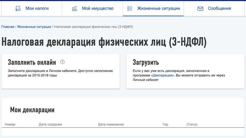 Во вкладке «Жизненные ситуации» есть раздел «Подать декларацию 3-НДФЛ», где можно заполнить декларацию по форме № 3-НДФЛ или загрузить уже заполненный документ. Здесь же можно отслеживать статус рассмотрения заявлений на налоговый вычет, сформировать заявление на возврат денежных средств и подать другие заявления в налоговую инспекцию.