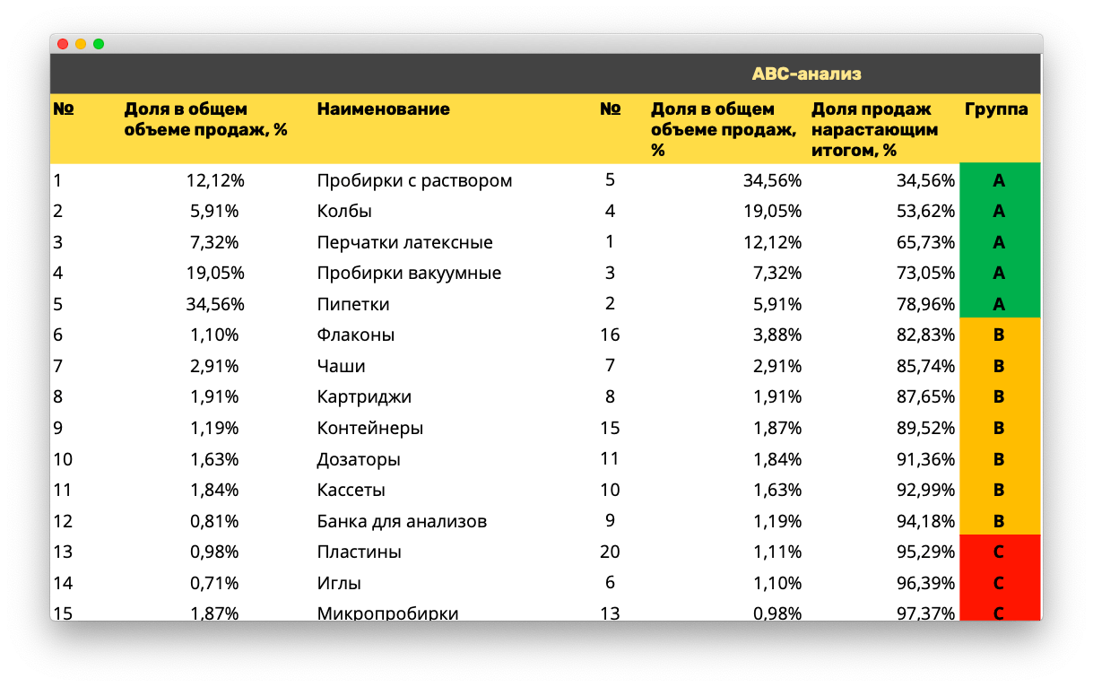 Затем внутри этих пяти групп снова провела ABC-анализ, потому что в каждой группе разные товары: не просто пробирки с раствором, а пробирки с раствором №1 на 6 мл, раствором №2 на 9 мл или с раствором №5, и они продаются по-разному.