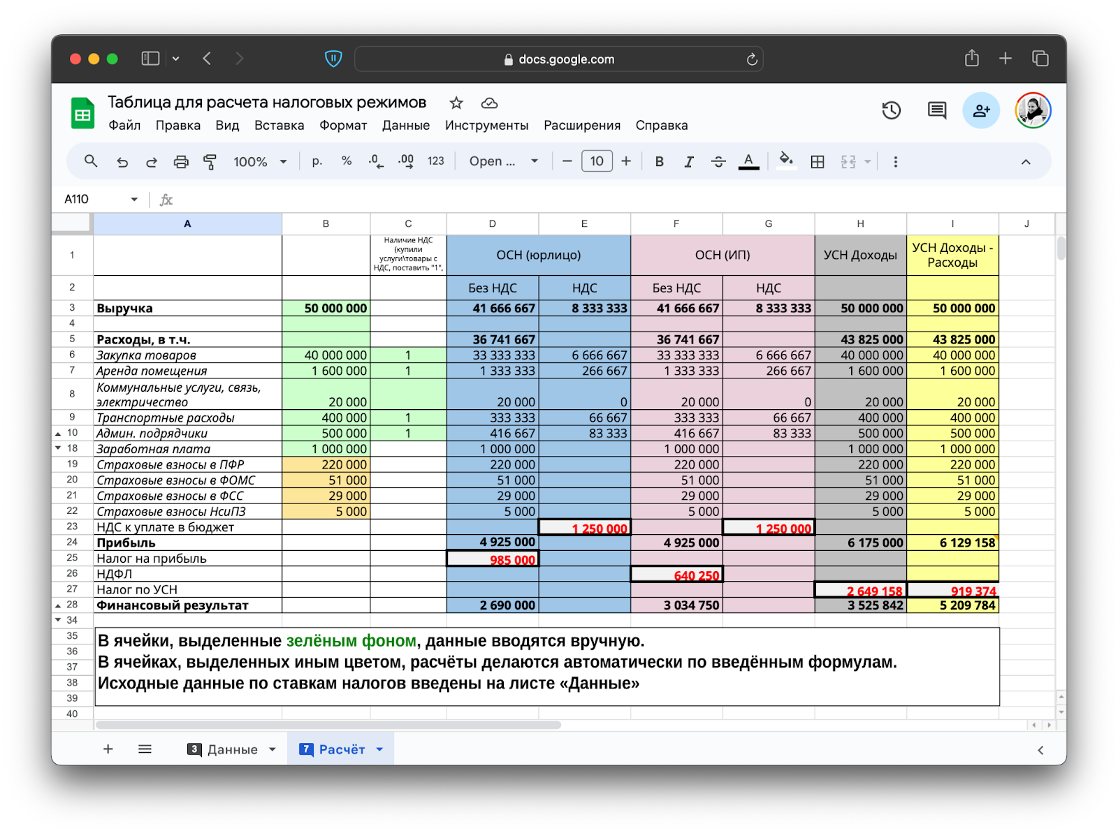 Чтобы правильно выбрать систему налогообложения, нужно для каждой из них рассчитать планируемые доходы и расходы бизнеса и сравнить результат. Финдиры Нескучных для этого используют эксель-таблицу: