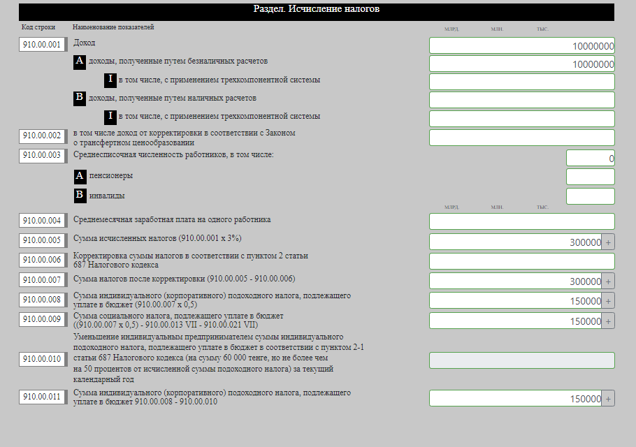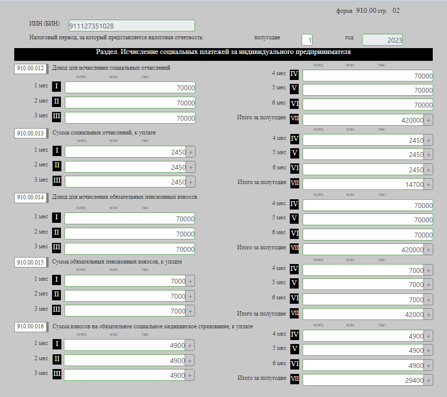В строке 910.00.001 указываем весь ваш оборот по ИП за 2 полугодие 2023 года. В данном примере у нас это сумма 1000000 (1 млн тенге).