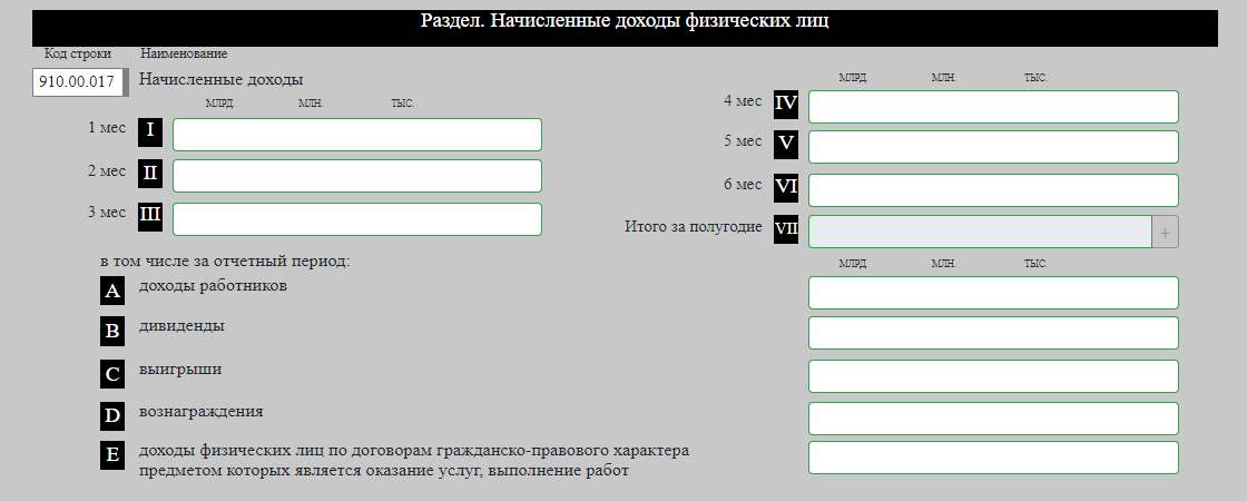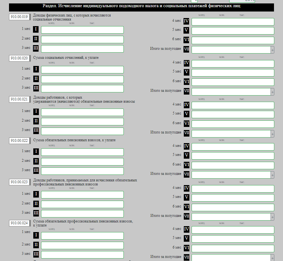Если вы работали и совершали оборот все 6 месяцев в полугодии, то просто в строках 910.00.012 и 910.00.014 укажите эту сумму для каждого из месяцев. Остальное рассчитается автоматически.