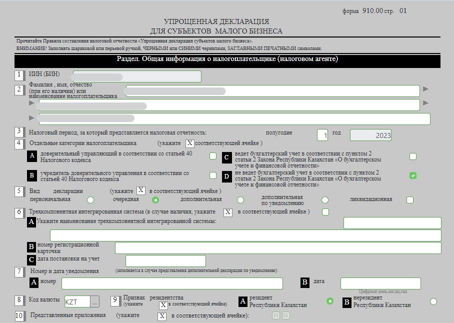 С 1 января 2020 года до 1 января 2023 года малый и микробизнес освобождены от уплаты КПН, ИПН, СН и ЕЗН. Сейчас мы сдаём форму за 2023 год и поэтому все налоги оставляем как есть.