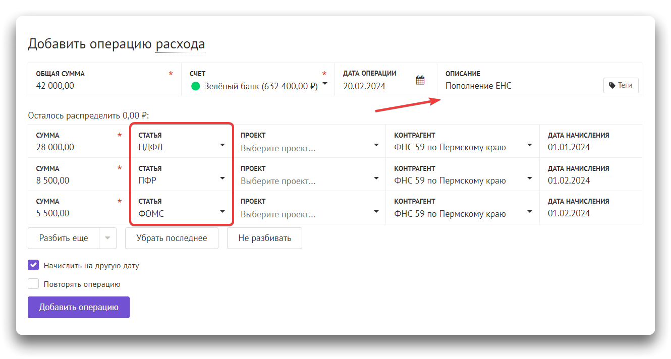 Поскольку сейчас расчеты по налогам идут чаще всего как пополнение ЕНС, то тут так же можно разбивать сумму на несколько частей и каждую из частей относить на нужную статью. Чтобы разбить сумму на несколько частей, нажмите на значок ️ рядом с суммой операции
