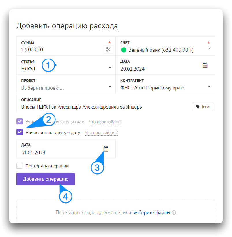 ️ ВажноПоскольку налоги и взносы не всегда платятся месяц в месяц, используйте галочку «Начислить на другую дату», чтобы учесть налоги в том периоде, к которому они относятся