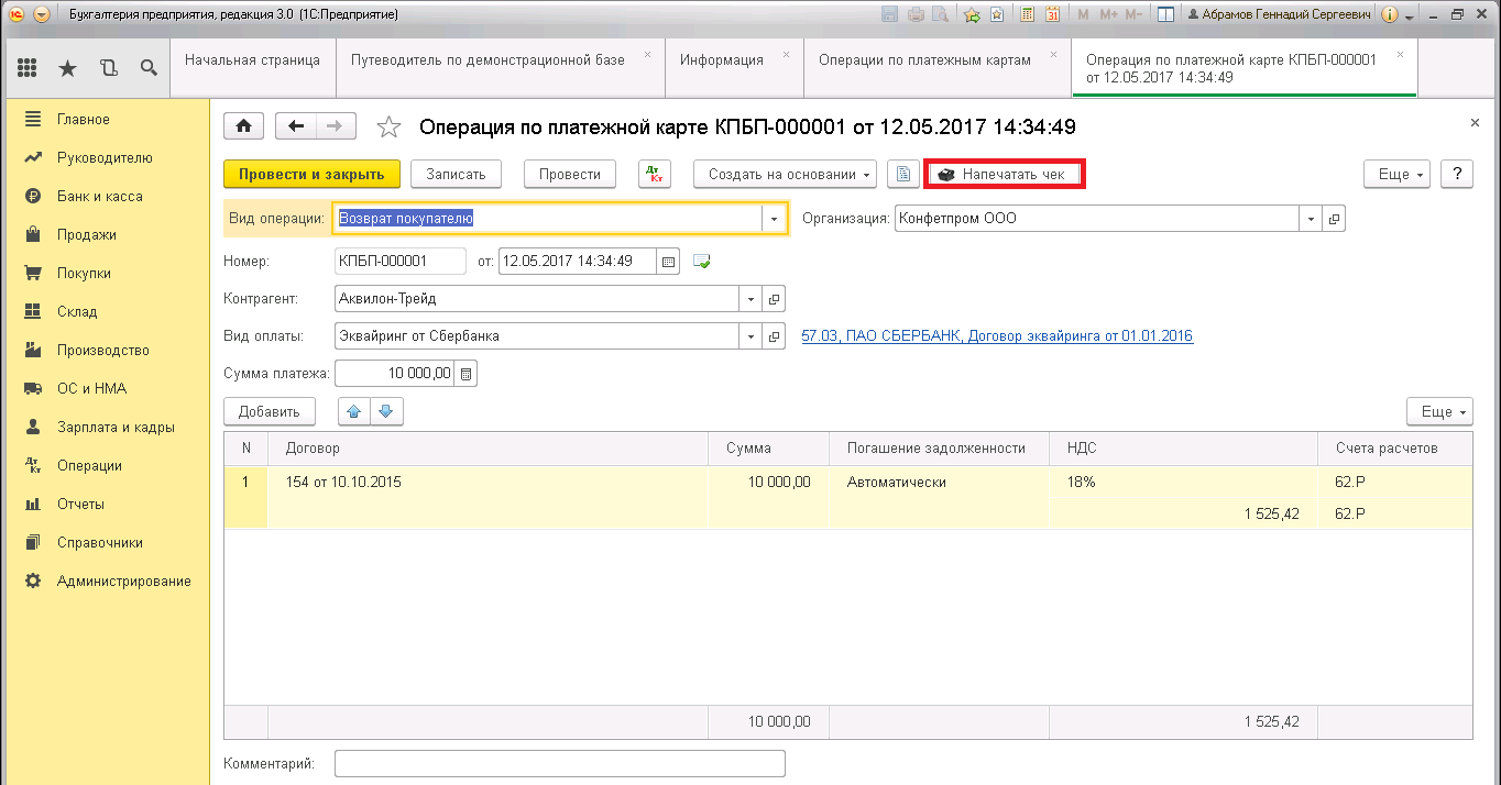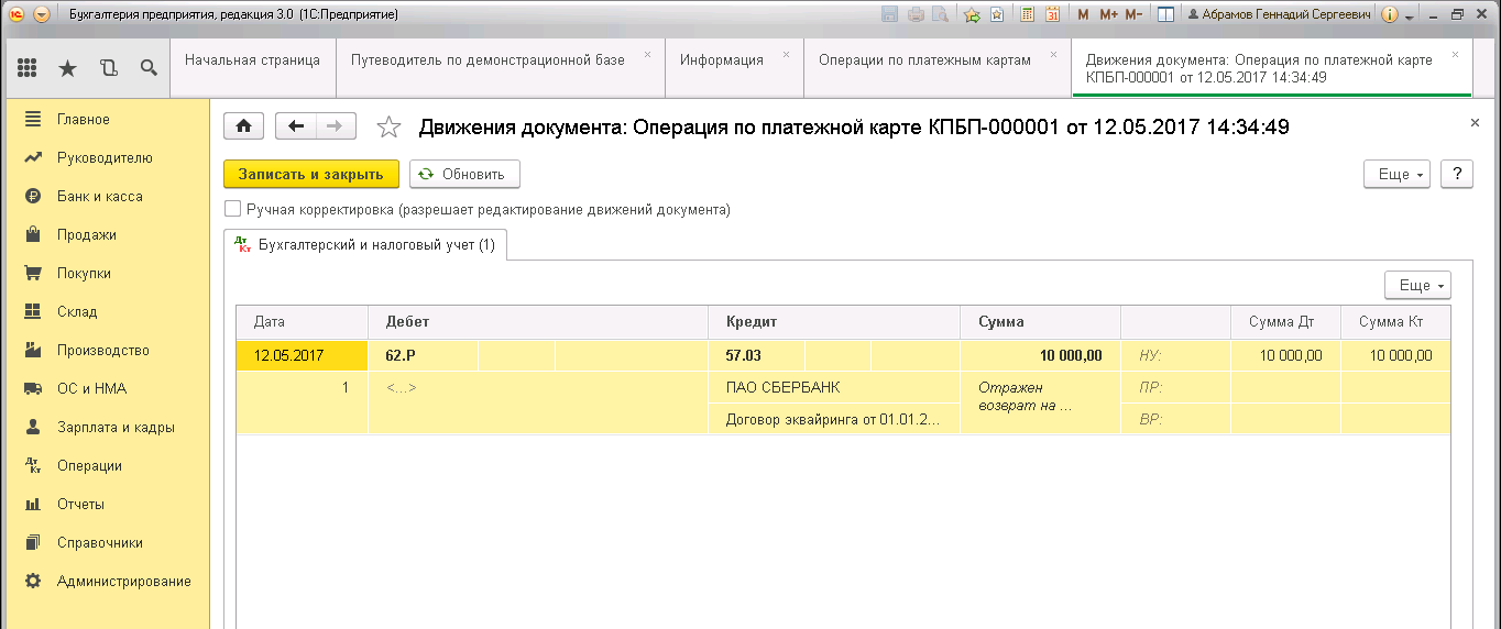 Отражение возврата в программе «Бухгалтерия 1С 8.3 при оплате по эквайрингу
