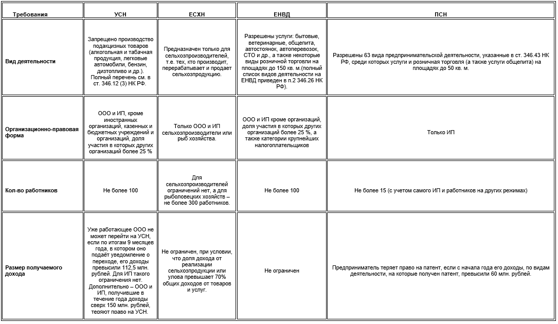 Для каждой системы налогообложения, исключая основную систему, разработан ряд критериев, которые определяют, может ли предприниматель или юрлицо применять эту систему. Как правило, ограничения касаются:
