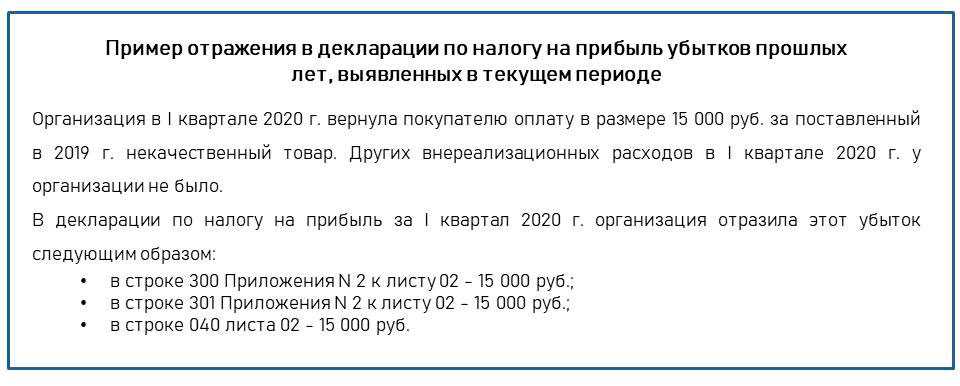 Убытки прошлых лет, обнаруженные в текущем отчетном (налоговом) периоде, отражаются в декларации по налогу на прибыль в особом порядке. Их нужно указать в полях 300-301 Приложения N 2 к листу 02 и учесть в общей сумме внереализационных расходов по строке 040 листа 02.