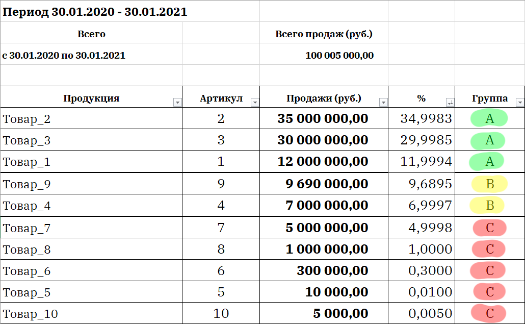abc анализ: таблица