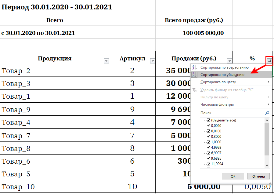 4. Фильтр задан → сортируем значения в столбце по убыванию, от большего к меньшему.