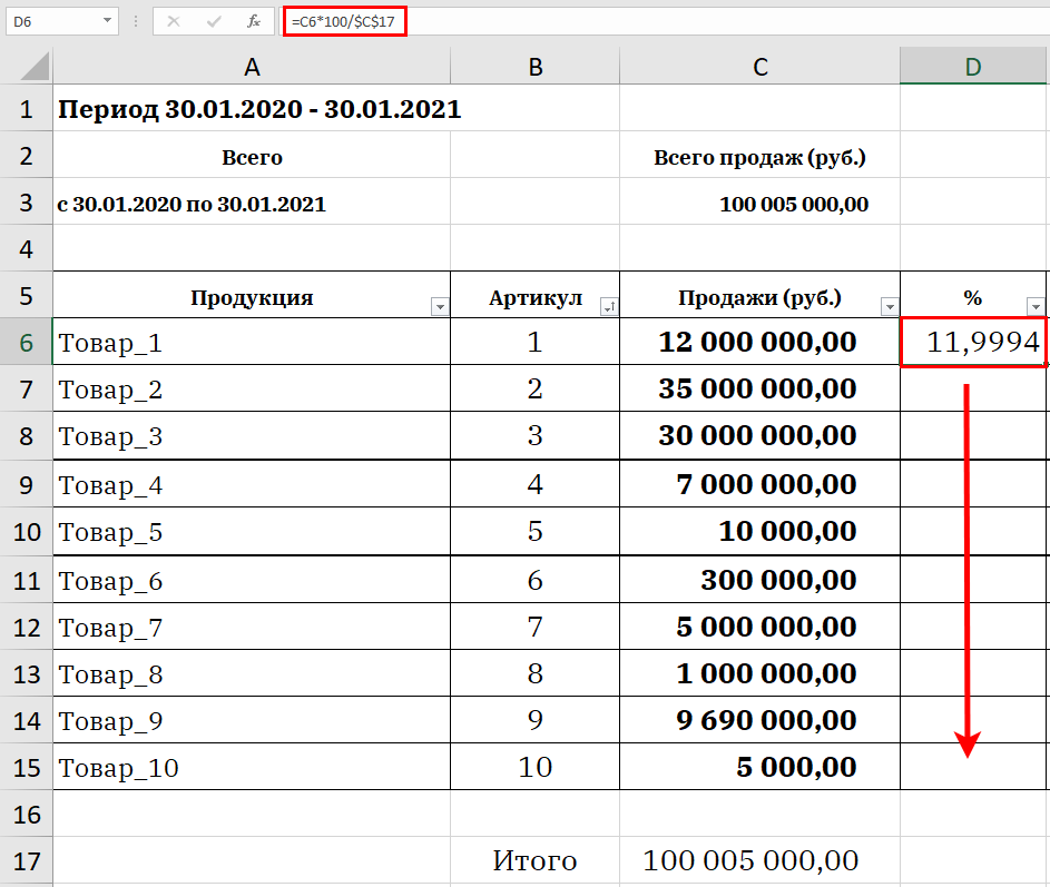 Чтобы не прописывать формулу для каждой ячейки отдельно, протягиваем формулу на все ячейки соответствующего столбца. Чтобы в этот момент ячейка «Итого» осталась на месте, ее нужно сначала закрепить. Для этого по правилам экселя в формулу нужно добавить значок $ — он применяется при закреплении. В нашей таблицы пример закрепления выглядит вот так: $C$17