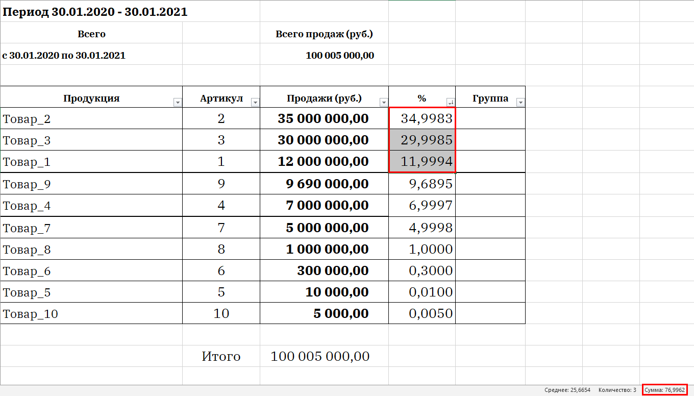 5. Делаем группировку. Чтобы не создавать отдельного столбца нарастающим итогом, мы можем просто последовательно выделять одну ячейку за другой, пока общая сумма не приблизится к нашему классическому соотношению в 80%. В нашем примере мы выделили группу А, общая сумма долей накопительным итогом составила 76,9%.