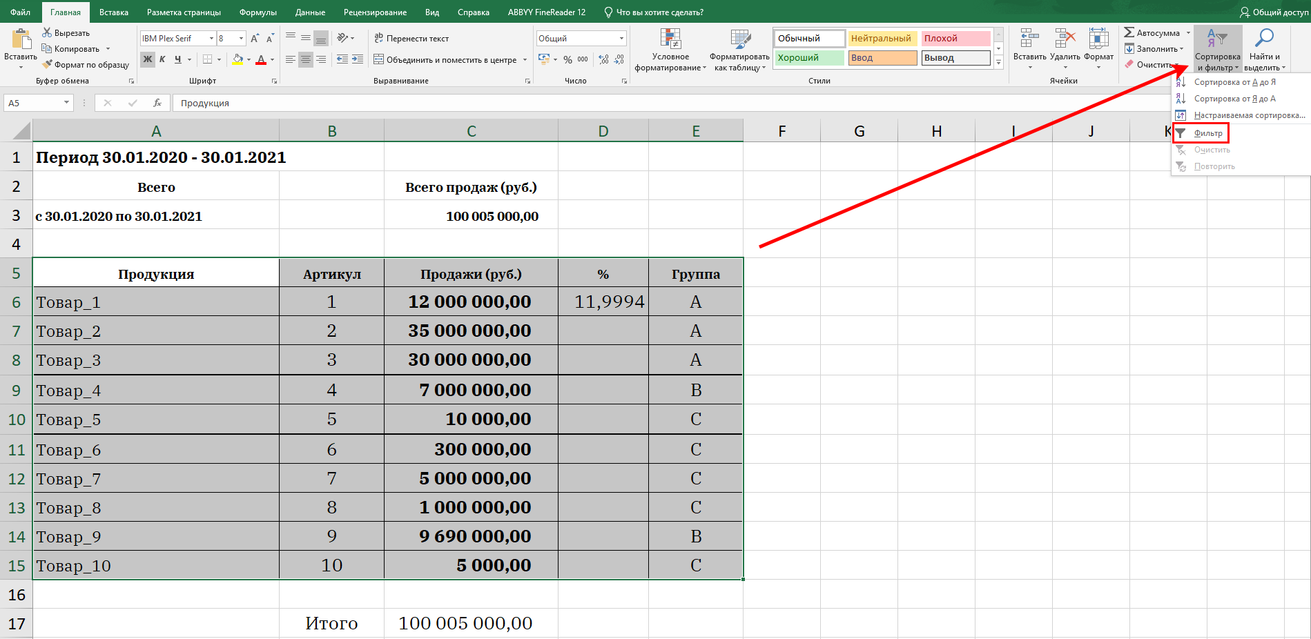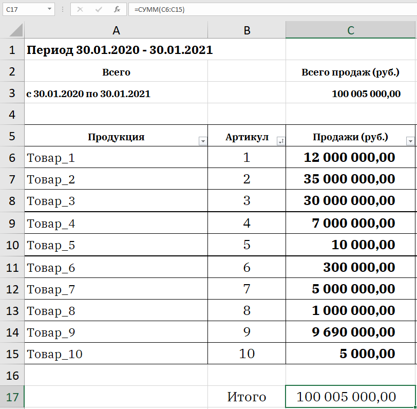 1. Выгружаем данные для анализа. Обычно их берут в учетной системе. Чтобы не усложнять пример ABC-анализа номенклатурой в 15 000 позиций, возьмем 10 условных товаров и объем продаж в рублях по ним. Тут же суммируем общую сумму продаж и выводим их отдельной строкой. Для этого прописываем отдельную строку «Итого» и задаем формулу, которая будет это суммировать.