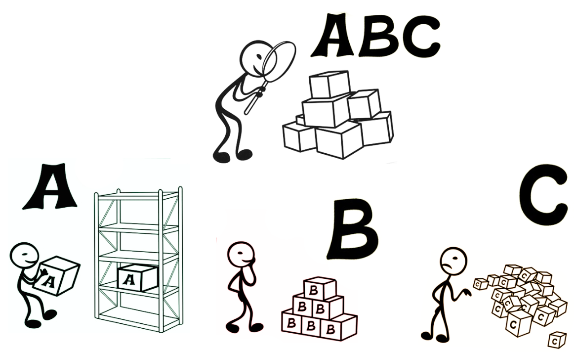 Почему анализ называется АВС? Все просто: A, B и С — это сегменты, на которые мы будем делить нашу базу данных. Разберем на примере ассортимента.