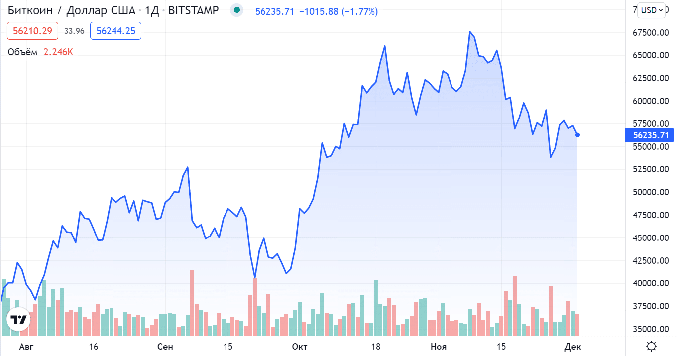 Например, на 2 декабря 2021 года стоимость биткоина равна 56 235 долларам США