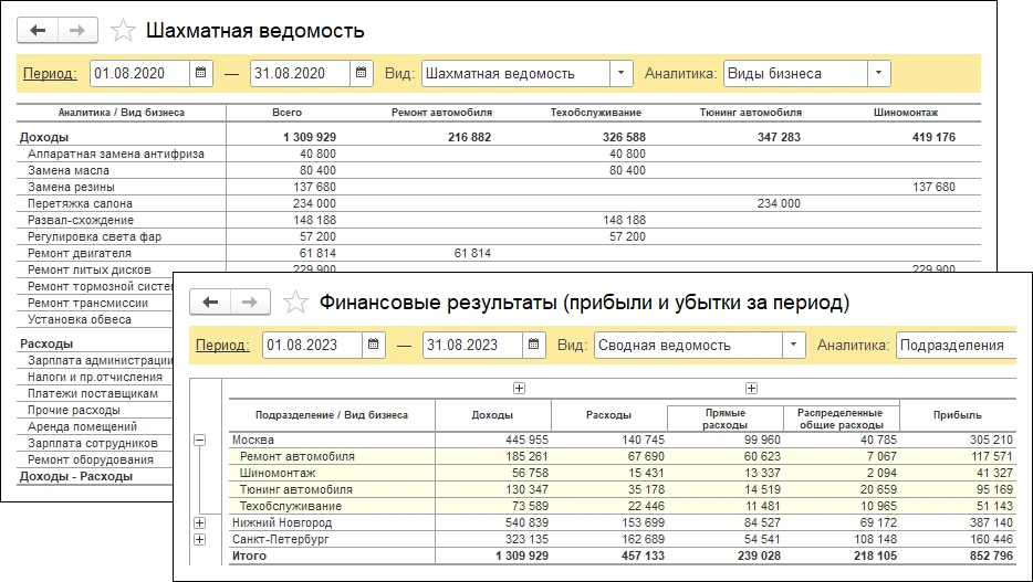 Отчет о финансовых результатах может составляться по-разному, к примеру, в 1С:Управляющем у него есть две формы: сводная ведомость и шахматная. Первый вариант удобен, если нужно увидеть соотношение общих расходов, распределенных по видам бизнеса, к прямым расходам по каждому виду бизнеса. А в шахматной ведомости видна развернутая аналитика по доходам и расходам направлений деятельности или подразделений.