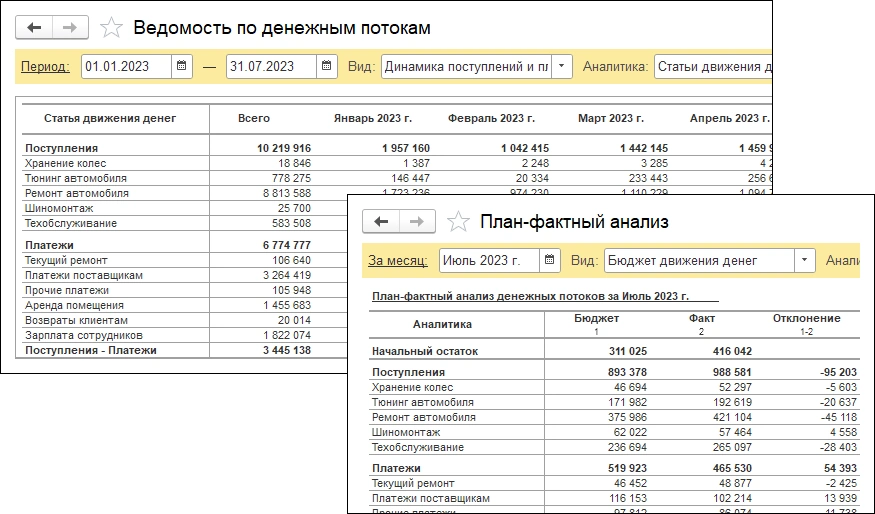 По статьям также составляются бюджеты, поэтому в форму отчета о движении денежных средств можно добавить столбцы с плановыми показателями. Это позволит получить отчет для проведения план-фактного анализа. С его помощью удобно сравнивать реальные денежные операции с плановыми и видеть отклонения факта от бюджета. Отчет CashFlow с любой необходимой аналитикой можно найти в финансовых сервисах и, разумеется, в программе 1С:Управляющий.
