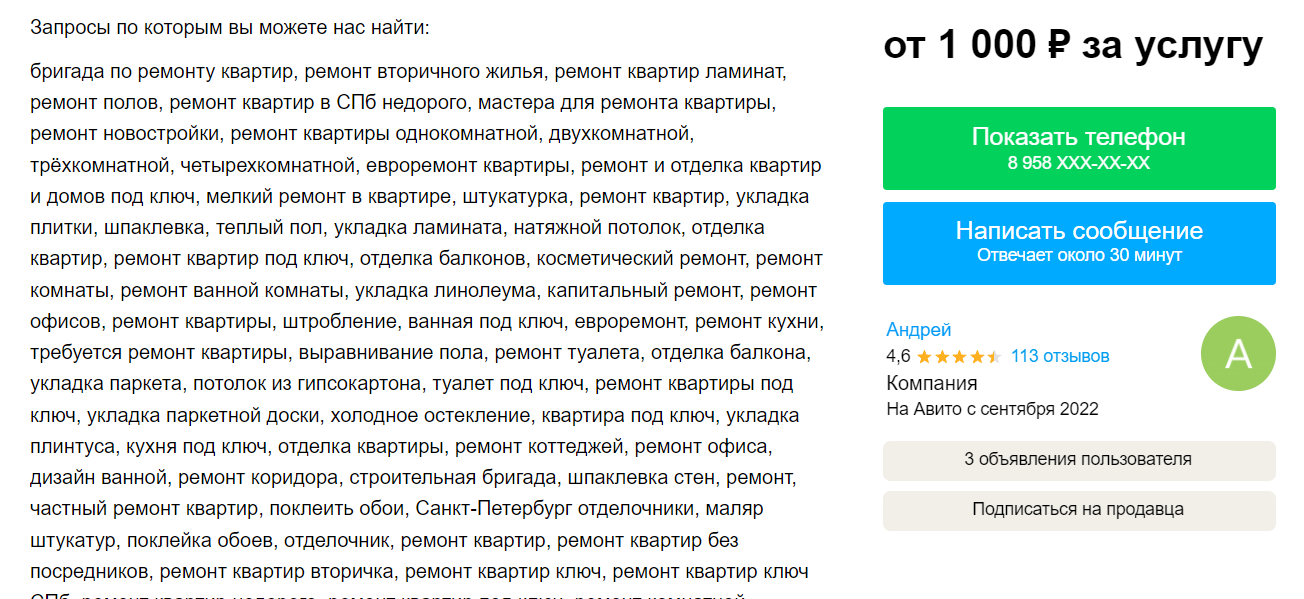 В этом примере автор, конечно, перестарался, но подход правильный — ремонт квартир могут искать по разным ключам, включая все перечисленные