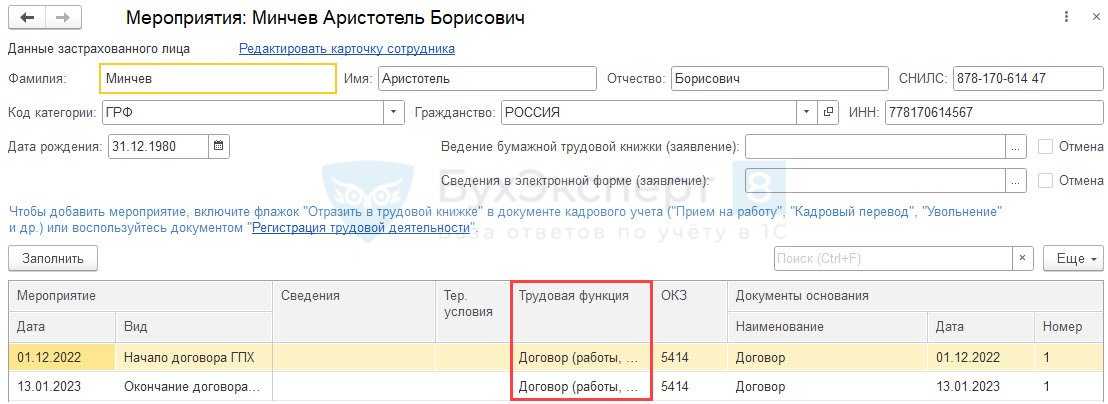 В форме расшифровки мероприятий документа СЗВ-ТД по договорникам ГПХ автоматически заполняется Трудовая функция – отсюда берется код выполняемой функции для файла выгрузки.