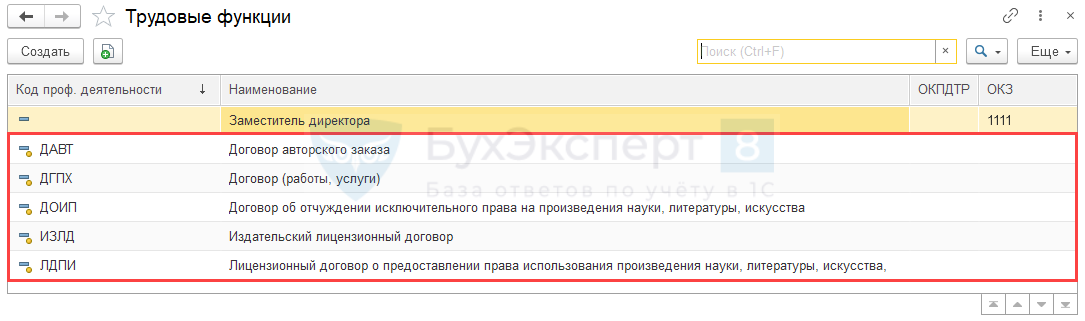 Коды выполняемой функции для договорников ГПХ хранятся в справочнике Трудовые функции (Настройка – Классификаторы) в виде предопределенных элементов.