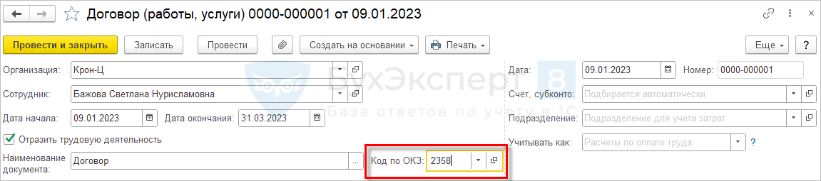Для мероприятий по договорам ГПХ в отчете ЕФС-1 обязательно указывать код ОКЗ. Для этих целей в документах Договор (работы, услуги) и Договор авторского заказа добавлен реквизит Код по ОКЗ. Его подбираем вручную из классификатора.