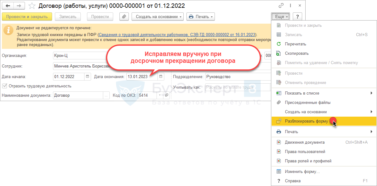 В этом случае потребуется открыть исходный Договор и исправить в нем Дату окончания. При этом, если по договору уже были переданы в СФР сведения о начале его действия, документ будет заблокирован. Разблокировать Договор можно по команде Еще – Разблокировать форму. После этого можно редактировать значение поля Дата окончания.