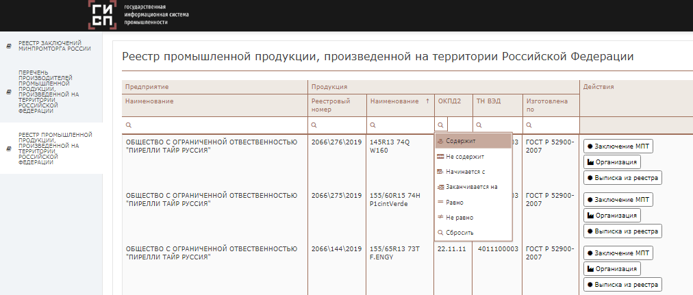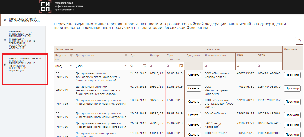 Шаг 5. В открытом окне выбираем реестр промышленной продукции, которая произведена на территории России. Таблица состоит из разделов:
