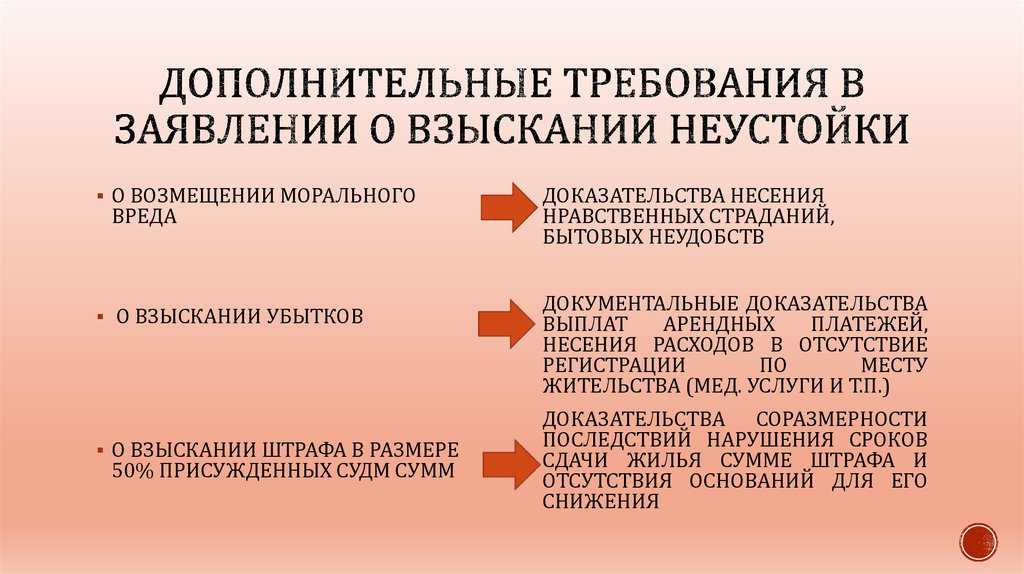 Если же дело дошло до разбирательств в судебном органе, то требование взыскать неустойку должно указываться как отдельная часть.