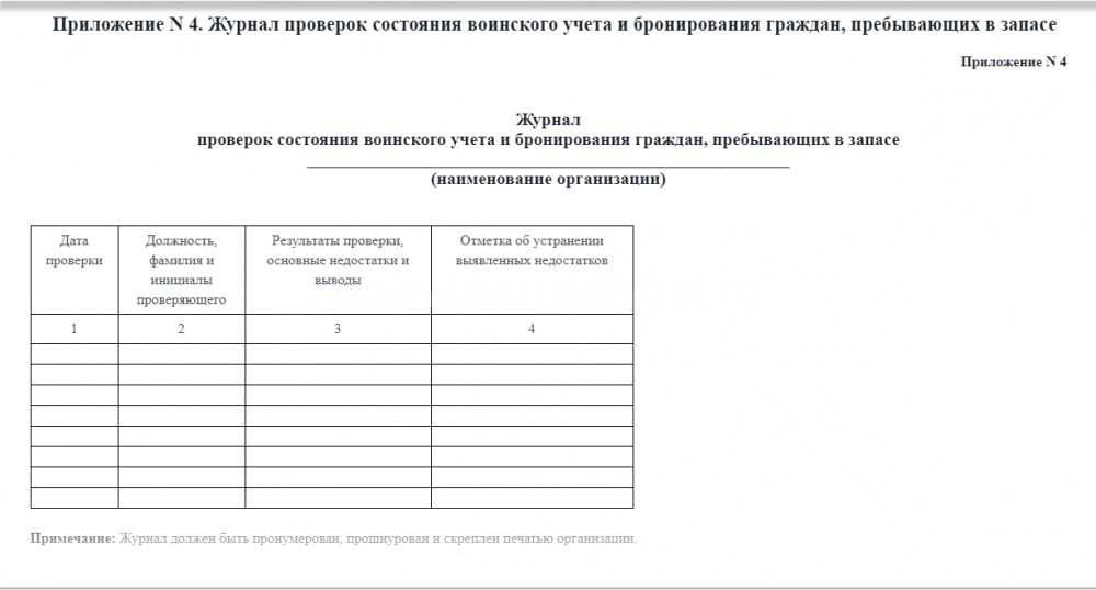 Третий шаг – заведение журнала проверок состояния воинского учета и бронирования военнообязанных. Его оформление производится в виде таблиц с графами, а сам документ содержит следующую информацию: