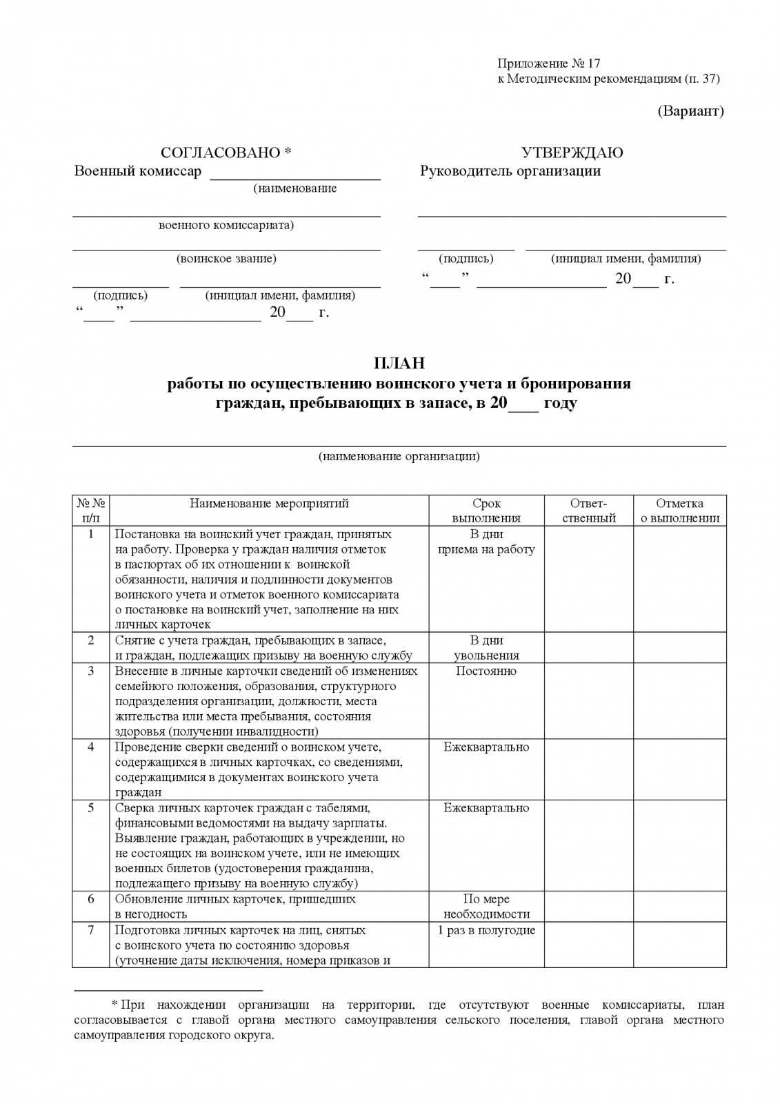 Второй шаг – составление плана работ по воинскому учету и его согласование с военным комиссариатом. Образец плана содержится в приложении 17 к методическим рекомендациям о ведении воинского учета Минобороны. В нем должна содержится следующая информация: