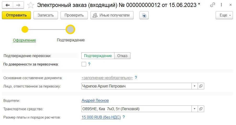 Перевозчик после получения заказа (заявки) подтверждает свое согласие с условиями перевозки или отказывается от нее с указанием причин. При подтверждении перевозки ответственный сотрудник вносит информацию о водителе, транспортном средстве и размере платы за перевозку (информация перевозчика), рис. 10.